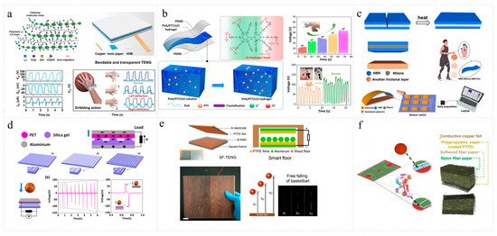 Moreover, Deng et al. designed a polyvinyl alcohol (PVA)/polytrimethylene terephthalate (PTT)/LiCl hydrogel as a flexible conductive triboelectric nanogenerator (PPL-TENG). The PPL-TENG can be affixed to the finger joint to monitor different degrees of bending of the finger joint, and it shows good stability and excellent repeatability when affixed in this manner, as shown in Figure 4b–d [50,51,52,53,54]. The PPL-TENG sensor installed at the bottom of the shoe generates distinguishable output signals based on the different gaits of basketball players during training, as illustrated in Figure 4e,f. Similarly, PPL-TENG placed at the elbow and knee can also recognize different degrees of joint bending, which offer indirect insights into the athlete’s motion posture.