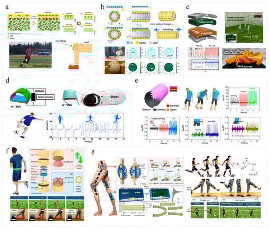 Another way to monitor gait is to integrate the TENG into a wearable device such as shoes. Qin et al. introduced a novel TENG integrated with a wave structure electrode (W-TENG) (Figure 5c) [57]. Compared to the traditional flat plate electrode TENG, the W-TENG with a wave structure electrode can achieve higher output performance. The maximum short-circuit current (Isc), transfer charge, and open-circuit voltage (Voc) of 2.56 μA, 29 nC, and 74 V were obtained at 300 N. Moreover, the output voltage signal of W-TENG can clearly reflect the different postures in football, while the W-TENG can perform real-time football monitoring (Figure 5d) [58]. For gait monitoring, Wu et al. proposed a novel PS/MXene-based triboelectric nanogenerator (PM-TENG) that has a drum structure design (Figure 5e) [59]. The PM-TENG can be installed on a football player’s shoulders, neck, wrist, elbow, knee, or ankle to achieve comprehensive monitoring.