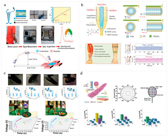 In badminton, athletes need to precisely control different movements operated by the muscles of the forearm. Ning used a continuous, one-step coaxial wet spinning process to synthesize triboelectric fibers featuring a diameter of merely 0.18 mm. These fibers comprise a liquid metal (LM) core enveloped by a polyurethane (PU) sheath. The superior mechanical properties of these materials ensure compatibility at their interface, thus eliminating issues of incompatibility within the triboelectric fibers. For wearable devices to be used for motion monitoring, comfort is a very important index. Through the application of digital embroidery and plain weave techniques, these fibers can be fabricated into extensive areas of textile-based triboelectric nanogenerators (T-TENGs). Such T-TENGs often find practical utility in energy harvesting and self-powered sensing applications. Specifically, when affixed to the forearm, they possess the capability to monitor a variety of stroke types in badminton, as shown in Figure 8b [71].
