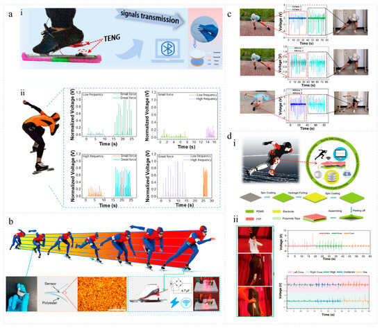 TENG-based sensors applied in skating: (a) Experimental design of a self-powered motion sensor for skating technique monitoring. (i) Shows the working mechanism of TENG. (ii) Signal display of TENG under different pedaling frequencies and pedaling forces [79]. (b) Design of self-powered portable flexible sensor [80]. (c) Application of TENG in terrestrial training [81]. (d) Micro-structured film-based flexible TENG for speed skating technology monitoring and biomechanical energy harvesting. (i) The output triboelectric voltage of MS-TENG attached to athlete 1’s ankle, knee, and coxa. (ii) Output friction voltages of TENG attached to the athlete’s ankle, knee, and hip [82].