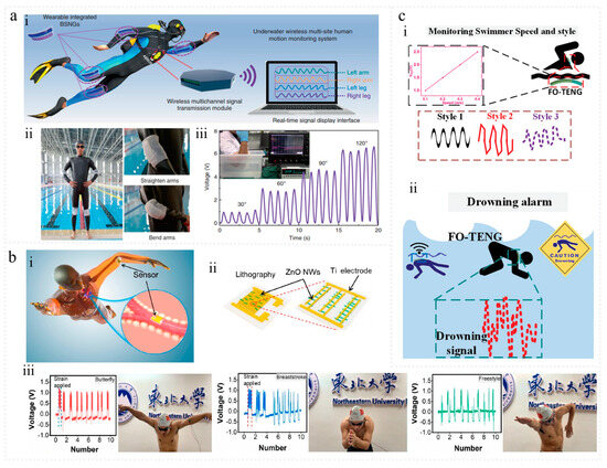TENG-based sensors applied in swimming: (a) Biomimetic stretchable nanogenerator (BSNG) inspired by electric eels. (i–iii) Demonstrate the underwater wireless multi-site human movement monitoring system, respectively. Illustration of an underwater wireless multi-site human movement monitoring system based on a bionic stretchable nanogenerator (BSNG) [83]. (b) Design and integration of a self-powered, flexible biosensor based on ZnO nanowire arrays and interdigitated electrodes. Different swimming styles can be analyzed using simple wireless transmitting and receiving stations. (i) Simulating the monitoring of athlete’s elbow joint angle and heart rate. (ii) Process of synthesis of self-powered biosensor. (iii) Output piezoelectric voltage of butterfly stroke, breaststroke and freestyle stroke [84]. (c) Ferrofluid-based friction nanogenerator. (i) FO-TENG positioned at the swimmer body to monitor the swimmer speed, and style. (ii) The drowning detection system based on FO-TNEG sensor to imitate the alarm as a safety consideration for the swimmer. Reprinted with permission from Ref. [85]. Copyright 2019, Wiley.