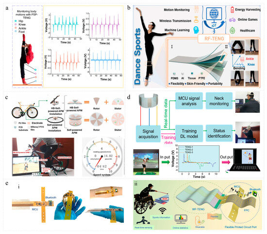 Moreover, Mao et al. used corn bract leaves as the friction material for constructing naturally biodegradable TENGs (NB-TENGs) for neck-condition monitoring (Figure 12d) [89]. The neck-condition monitoring triboelectric sensor (NCM-TS) consisting of three NB-TENGs was fixed to a neck collar to capture and analyze the neck motion. To establish the practicality of the wearable device, a deep learning model was designed to recognize four types of neck motion in golf sports, which achieved an average recognition accuracy of 94%. Finally, Mao et al. developed a wireless intelligent sensing system (WISS), which includes a WF-TENG sensing port integrated with the wearable flexible triboelectric nanogenerator (WF-TENG), flexible printed circuit (FPC), a Bluetooth wireless transmitter, along with the upper computer digital signal receiving intelligent processing port (Figure 12e) [90]. The system can monitor wheelchair curlers’ curling skills and human-computer interactive simulation training in real time.
