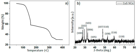 Thermogravimetric analysis (TGA) was used to observe the combustion reaction. The reaction was carried out in ambient air, using a heating rate of 10 °C min−1. As depicted in Figure 1a, the reaction demonstrated a pronounced and steep mass loss at a temperature range of ~120–150 °C as seen in the TGA curve, credited to the formation of CuS by SCS. A secondary stage of mass loss appeared at around 300 °C, which was attributed to the oxidation of organic residues and the transformation of CuS to CuSO4, as confirmed by XRD of the residual material calcinated at 300 °C (Figure S1) [72]. This suggests that the synthesis of CuS NPs by the combustion approach can efficiently occur at a significantly lower temperature.
