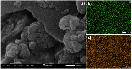 In order to evaluate the CuS morphology, field emission scanning electron microscopy (FE-SEM) was employed. The FE-SEM image depicted in Figure 2a confirms that CuS consists of spherical nanoparticles with an average size of ~10 nm. The SEM-EDS elemental mapping depicted in Figure 2b,c reveals a homogeneous distribution of Cu and S elements throughout the CuS material, suggesting a uniform composition for all CuS NPs. The EDS analysis showed that the average atomic ratio of Cu to S was 1:1 (Figure S2).