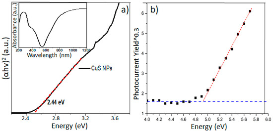 The inset in Figure 3a displays the UV-Vis/NIR absorption spectrum of the CuS NPs. CuS NPs exhibited a pronounced optical absorption onset in the visible region at a wavelength of approximately 510 nm. This absorption was associated with an energy band gap (Eg) of 2.44 eV, according to the corresponding Tauc plot for direct allowed transition, i.e., (αhv)2 vs. photon energy plot (Figure 3a). The Eg of CuS NPs was similar to other reported values of CuS materials synthesized at the nanoscale that show a slight blue shift in comparison to corresponding bulk material (Eg~2.4 eV), possibly related to quantum confinement effects [10]. The absorption tail at longer wavelengths arose from scattering effects and/or inter-band transitions from the valence band to mid-gap states in the CuS nanoparticles [74,75]. Figure 3b shows the photoelectron spectroscopy in air (PESA) measurement data of the photocurrent yield0.3 against the photon energy of a CuS NP film. The intersection of the linear line of best fit (red dashed line) after photoelectron emission onset with the baseline (blue dashed line) gave the value of the CuS ionization energy (IE), ~4.9 eV [76].