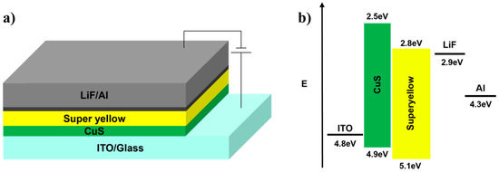 Schematic illustration of (a) normal SY:OLEDs (ITO/CuS/SY/LiF/Al) and (b) flat band diagram of the standard configuration of a Super Yellow OLED device.