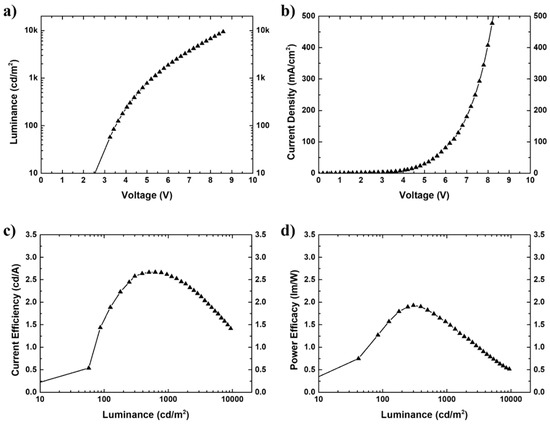 Electroluminescent performance of OLED devices based on the ITO/CuS/SY/LiF/Al device structure: (a) luminance-voltage characteristics (LV), (b) current density-voltage (JV) characteristics, (c) current efficiency as a function of luminance, and (d) power efficacy as a function of luminance.