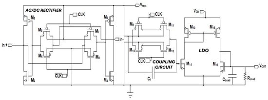 Figure 3 depicts the proposed power management circuit for a piezoelectric energy harvester, which is integrated with a reconfigurable rectifier (cross-coupled with two transmission gates), a coupling circuit, and an LDO that has a differential pair. In addition, there is a circuit between the reconfigurable rectifier and the LDO circuit which consists of two transmission gates and a capacitor. This circuit allows the tracking of the rectifier output signal to the input of the regulator, avoiding the drop and loss of voltage from one stage to another with ~10% more efficiency in voltage ranges from 0.7 to 2 V. Without this circuit, the rectifier and the LDO have considerable voltage drop losses at the output and its optimal operation starts at 2 V. This structure can reduce forward voltage drop and improve the PCE under low input voltages.