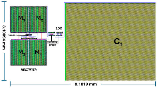 Finally, the LDO regulator ensures a stable DC output voltage under different loading and input conditions. Figure 4 shows the complete layout of the proposed PMC, considering a total silicon area of 8100.94 μm × 8181.9 μm. The interdigitated technique was used to decrease the area consumption, and a 0.18 μm CMOS technology model from TSMC was employed with 6 metal layers and one polysilicon layer and obtained from MOSIS (run: T18H). The output voltage is maintained at 1.8 V, regulated from the rectified and coupled input, with a power conversion efficiency exceeding 35% under nominal load conditions (50 kΩ).