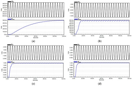 Figure 5a–d illustrates the post-layout behavior of four samples of the input and output signal of the proposed PMC. Figure 5a depicts an input voltage of 0.7 V with an output voltage of 0.504 V and a voltage regulation that starts from 120 ms. For Figure 5b, there is a voltage regulation close to 20 ms with an input voltage of 1.2 V and an output voltage of 0.806 V. Figure 5c shows an input voltage of 2.5 V and an output voltage of 1.19 V, with voltage regulation close to 20 ms. On the other hand, Figure 5d registers a regulation of input voltage of 2.8 V and output voltage of 1.21 V after from 20 ms. These results allow us to predict the different ranges of optimal operation (0.7–2.8 V) in the rectifier and the LDO circuit. In addition, these results confirm the voltage regulator capability of the proposed circuit, keeping a stable output voltage. Also, no overshoot or undershoot is observed, indicating effective loop compensation.