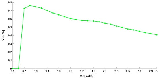 Thus, the performance of a power management circuit can be determined using the VCE and PCE values. Figure 6 illustrates VCE values of the proposed PMC across the input voltage sweep. The circuit achieves a peak VCE of 72.8% at 0.7 V input, gradually decreasing to 43.21% at 2.8 V. This decline is due to increasing losses in the pass devices and intrinsic resistance within the LDO and rectifier at higher voltages. However, the coupling stage minimizes transition losses, maintaining a relatively stable VCE above 40% across the full range. Based on the results of Figure 6, the VCE and highlights that at voltages below 1 V the circuit achieves efficiencies above ~73%. Figure 7 illustrates the PCE of the proposed PMC, achieving efficiencies above 35% at load currents of 10 µA under a 50 kΩ load resistance. This level of efficiency is competitive for circuits operating under ultra-low-power harvesting conditions where trade-offs between regulator stability and active loss minimization must be balanced. Thus, this power management circuit of piezoelectric energy harvesters could be used for low-power devices.
