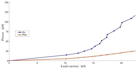Figure 8 depicts the performance of the proposed circuit in terms of input and output power at load currents in the range of 5 µA to 30 µA. With this circuit, we could power IoT sensors that require low power. The output power increases with load resistance until a saturation point of ~150 µA, which corresponds to the regulator’s maximum designed output. Beyond this, output voltage drops due to limited current drive. The coupling capacitor improves energy delivery by storing and smoothing transitions between energy pulses.
