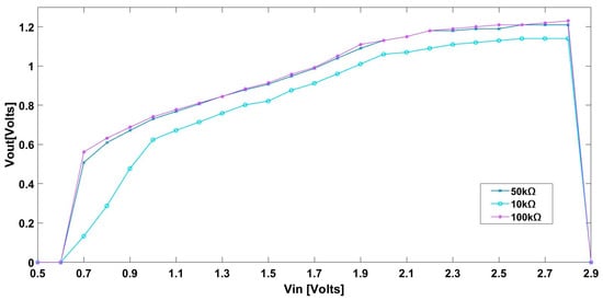 Figure 9 shows a comparison of the relationship between the input and output voltages of the proposed circuit by varying different load resistors of 10 kΩ, 50 kΩ, and 100 kΩ. Better power performance can be observed at load resistances between 100 kΩ and 50 kΩ. Figure 9 illustrates Vout behavior across various input voltages and load resistances. At lower load resistances (higher current), the regulator maintains a near-constant output until the drive limit is exceeded. This result demonstrates acceptable load regulation (1.2%) and line regulation (0.5%). The output capacitor (1 µF) maintains loop stability with a simulated phase margin higher than 45°, preventing ringing or overshoot.