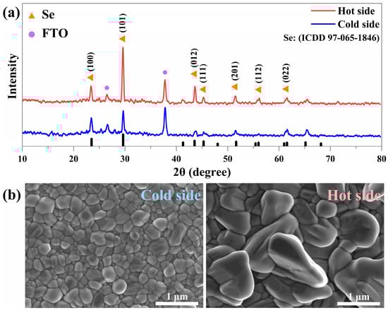 Figure 2. (a) XRD patterns of the Se thin films prepared by the VTD method; (b) SEM images of the surfaces of the Se thin films corresponding to the cold and hot sides. All samples were annealed at 180 °C for 3 min.