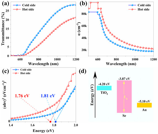 where n = 2 for direct bandgap semiconductors. As shown in Figure 3c, by plotting (αhν)2 against photon energy () and extrapolating the linear region to its intercept with the horizontal axis, the bandgap values were calculated to be 1.76 eV for the hot-side film and 1.81 eV for the cold-side film. The narrower bandgap of the hot-side film likely stems from its improved crystallinity and reduced structural disorder, which diminish mid-gap states. Figure 3d shows the schematic energy diagram based on the band positions of selenium [1], TiO2, and Au, illustrating the mechanism of photogeneration of carriers and their separation.