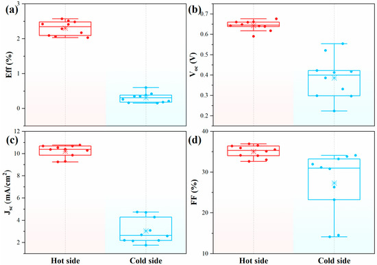 Figure 4. Box charts of (a) Eff, (b) Voc, (c) Jsc, and (d) FF for the Se solar cells prepared by the VTD method at the hot and cold side.