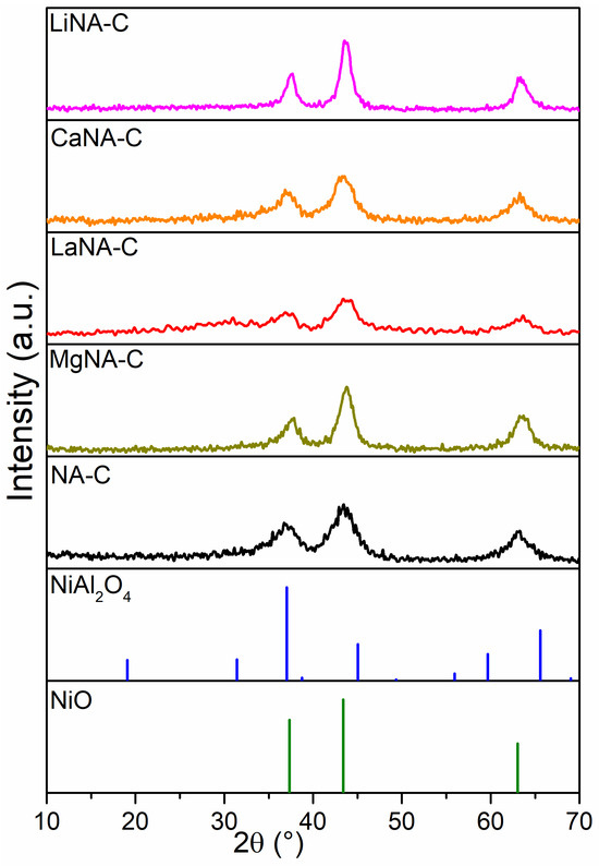 The XRD patterns of calcined samples are shown in Figure 1. All samples exhibited diffraction peaks at approximately 37.2°, 43.7°, and 62.8°, which corresponded to the cubic NiO planes on the (111), (200), and (220) planes, and/or spinel-type NiAl2O4 phases on the (311), (400), and (440) planes, respectively [44,45]. These results indicate that the incorporation of alkali metals did not significantly alter the crystalline structure of the NiO and NiAl2O4 phases. Although it is not possible to identify NiAl2O4 phases from NiO purely by XRD due to overlapping peaks, it is well-reported in the literature that LDH-derived catalysts tend to form nickel aluminates after calcination [46,47]. Furthermore, the reconstructed samples (LiNA-C, MgNA-C, CaNA-C, and LaNA-C) exhibited only the presence of NiO and/or Ni-containing spinels without any additional oxide phases being detected. These results suggest that the incorporated metals were successfully integrated into the LDH lattice during the reconstruction process.