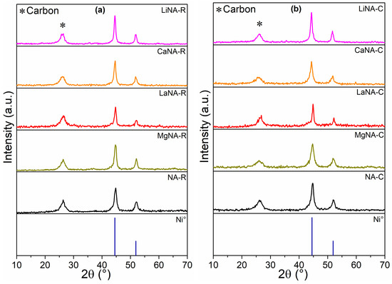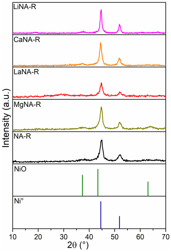 The XRD patterns of the reduced samples are illustrated in Figure 2. These diffractograms reveal reflections of the metallic Ni (Ni°) phase, indicating that the conditions were enough to complete the reduction of most of the oxides. Meanwhile, some samples (LiNA-R, MgNA-R, CaNA-R) present a small peak at 37.5° (311), likely related to mixed oxide phases that could not be completely reduced [48,49]. All samples showed two reflections at 44.8° and 51.9°, corresponding to the Ni0 (111) and (200) crystal planes [50].