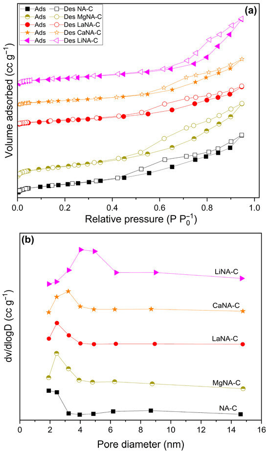 The specific surface area, pore volume, and pore diameter data obtained from N2 adsorption-desorption analyses are compiled in Figure 3 and Table 1. At the same time, results for NA-C and MgNA-C samples are found in Rosset et al. (2021) [38]. Notably, the reconstructed samples present a lower surface area than the NA-C sample, and the pore volume, except for the Li-containing samples, does not follow a clear trend. Additionally, the pore diameter increased in most samples, particularly in the LiNA-C sample. These results may be related to the incorporation of different metals during reconstruction into the lamellae, which obstruct the existing pores of Ni-Al and consequently hinder the total surface area after calcination, as well as cause pores to collapse, increase pore diameter, and diminish pore volume [55,56].