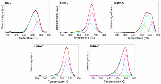 Figure 4 presents the CO2 desorption profiles Figure 4 presents the CO2 desorption profiles and the corresponding deconvolution curves using Gaussian functions, while Table 2 summarizes the peak temperatures and quantification of basic sites. All samples exhibit a broad, asymmetric main peak that is more intense at lower temperatures. Due to their asymmetry, deconvolution was applied, revealing three overlapping desorption peaks previously observed in the literature [38,58,59]. The first peak, ranging from 100 °C to 250 °C, is addressed to weak basic sites derived from surface hydroxyl groups (OH−); from 250 °C to 350 °C related to medium-strength basic sites, related to Lewis acid-base metal oxide pairings (M2+-O2−); and 350 °C onwards related to strong basic sites due to adsorption on low-coordination surface O2− [52]. The NA-C sample primarily consists of medium- and strong basic sites, as well as high basicity. Despite the reconstruction of the samples with alkaline elements, their total number of basic sites decreased to less than half, except for CaNA-C and LaNA-C.
