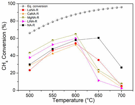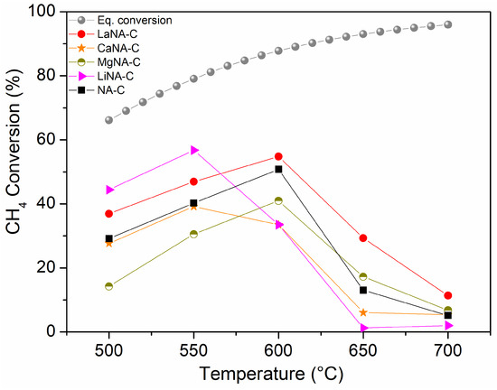 Figure 6 shows the CH4 conversion for samples activated with H2, while samples in Figure 7 were activated under the CH4 stream, ranging from 500 to 700 °C. The effect of temperature on the equilibrium conversion of methane is presented in Figure 6 and Figure 7 for a pressure of 1 bar and temperatures ranging from 500 °C to 700 °C. These were calculated based on the minimization of Gibbs free energy, considering the formation of solid carbon as a product, as predicted by the global reaction [69].
