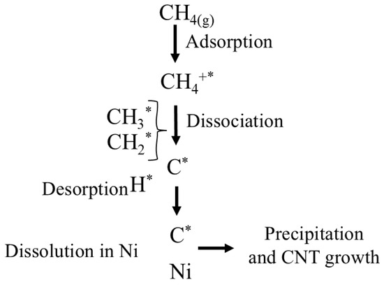 The mechanism of the CMD reaction was based on combining Langmuir–Hinshelwood surface reactions with a dissolution–precipitation model typical of carbon nanostructure growth on Ni catalysts, as shown in Figure 9 [73,74]. Methane gas (CH4 (g)) is first adsorbed onto active nickel sites (Ni0), represented by “*”. Subsequently, (CH4*) undergoes stepwise dissociation of the C-H bonds, forming surface-bound intermediates (CH3*, CH2*, CH*, and C*) and hydrogen atoms (H*). Hydrogen desorbs from the surface as H2 gas. Surface carbon (C*) may either dissolve into the nickel bulk (dissolution) or be precipitated as carbon nanotubes (CNT). This cycle continues until the accumulation of carbon leads to the deactivation of the active sites through encapsulation or sintering of the Ni sites.
