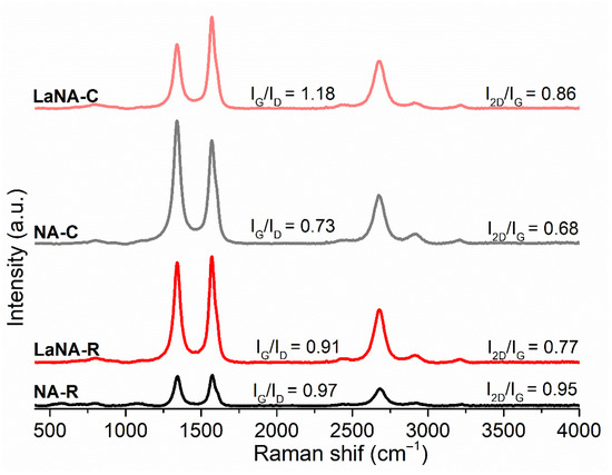 For the La-promoted samples, the results diverge from the non-promoted ones regarding the activation method. The LaNA-C sample exhibits highly ordered or graphitized carbon (IG/ID = 1.18) with a high stacking degree (I2D/IG = 0.86), which strongly suggests the formation of well-graphitized carbon filaments (CNFs) with a low defect density. This type of carbon prevents disorganized carbon deposition and is associated with less prejudice to catalytic activity. The LaNA-R sample, on the other hand, exhibits a less ordered carbon structure (IG/ID = 0.91) and a lower stacking density (I2D/IG = 0.77) compared to LaNA-C. While still more ordered than NA-C, this suggests that for catalysts activated with H2, the presence of La may lead to a less ordered carbon structure in the CH4-heating activation, potentially indicating that the active phase was more prone to deactivation under these conditions [4,83].