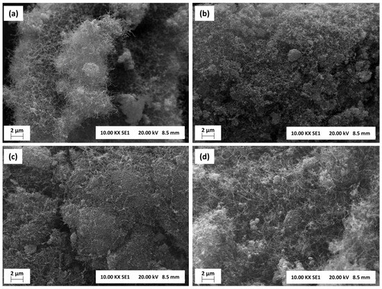 The scanning electron microscopy (SEM) images of samples subjected to stability tests at 700 °C are shown in Figure 14. As corroborated by the XRD, TPO, and Raman analyses, carbon filaments or nanotubes are deposited on the surface of all catalysts. As stated by the Raman results, the CNFs or CNTs are disorderly spread over the surface, independent of the activation pathway; subsequently, carbon accumulation is mainly linked to the reaction temperature and the nature of the catalyst.