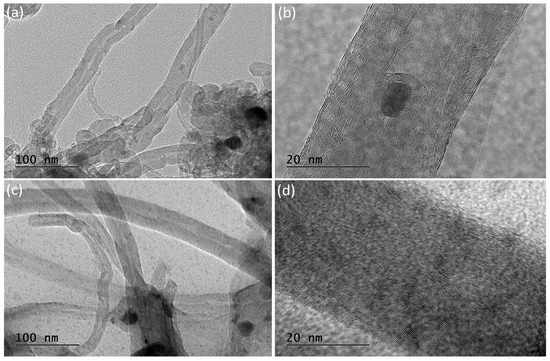 Transmission electron microscopy (TEM) images of the spent catalysts after stability tests at 700 °C, LaNA-C and LaNA-R, are presented in Figure 15. The micrographs reveal that the carbon filaments previously observed in the SEM analysis are composed of multi-walled carbon nanotubes (MWCNTs) in both samples. These nanotubes exhibit a well-defined tubular morphology with concentric graphitic layers. Notably, some nickel nanoparticles are encapsulated within the inner channels of the nanotubes, as visible, particularly in Figure 15a,b. Compared to LaNA-R, the LaNA-C sample (Figure 15c,d) displays a higher degree of graphitic order, as evidenced by the more regular and parallel graphene walls.