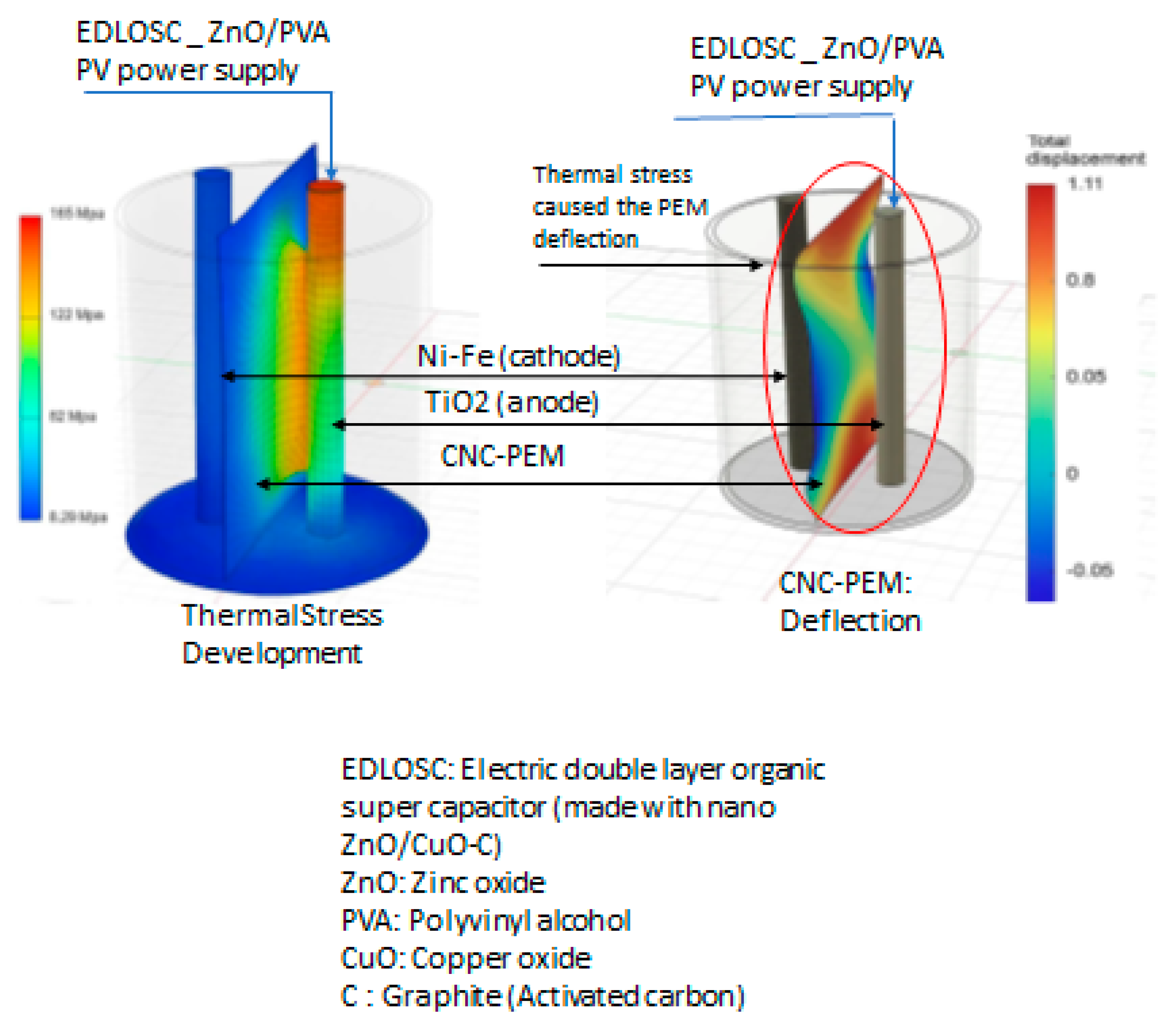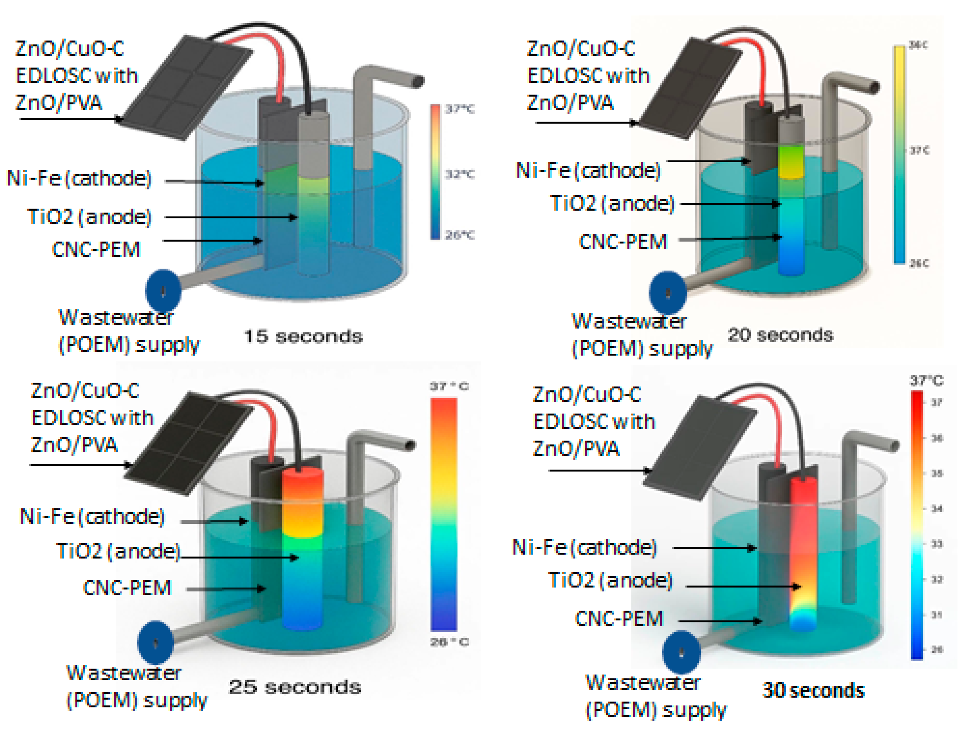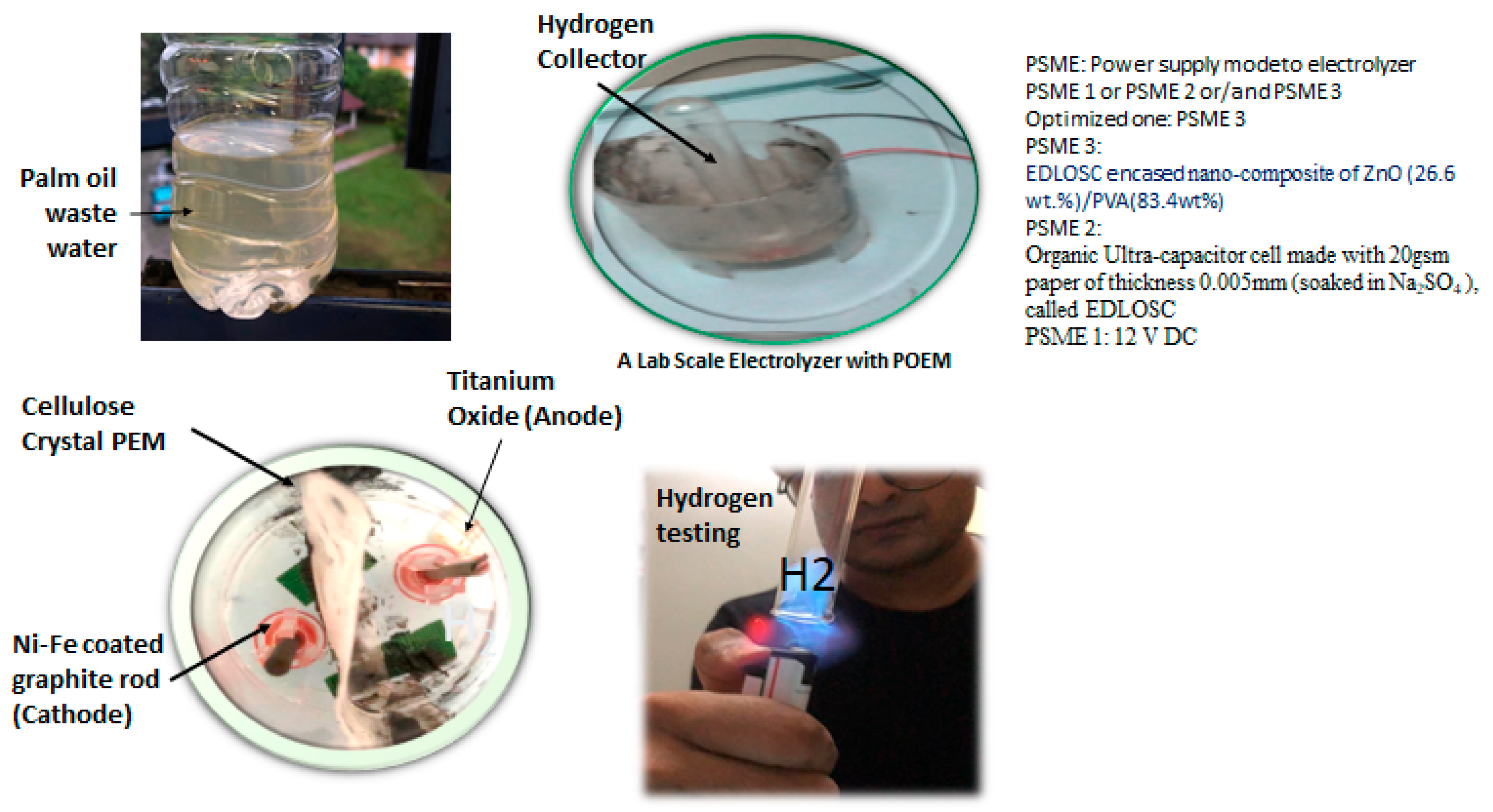 - EDLOSC (ZnO/CuO RP with encased solar film made with ZnO/PVA) to provide the power supply to the ME in situ H2 production.
