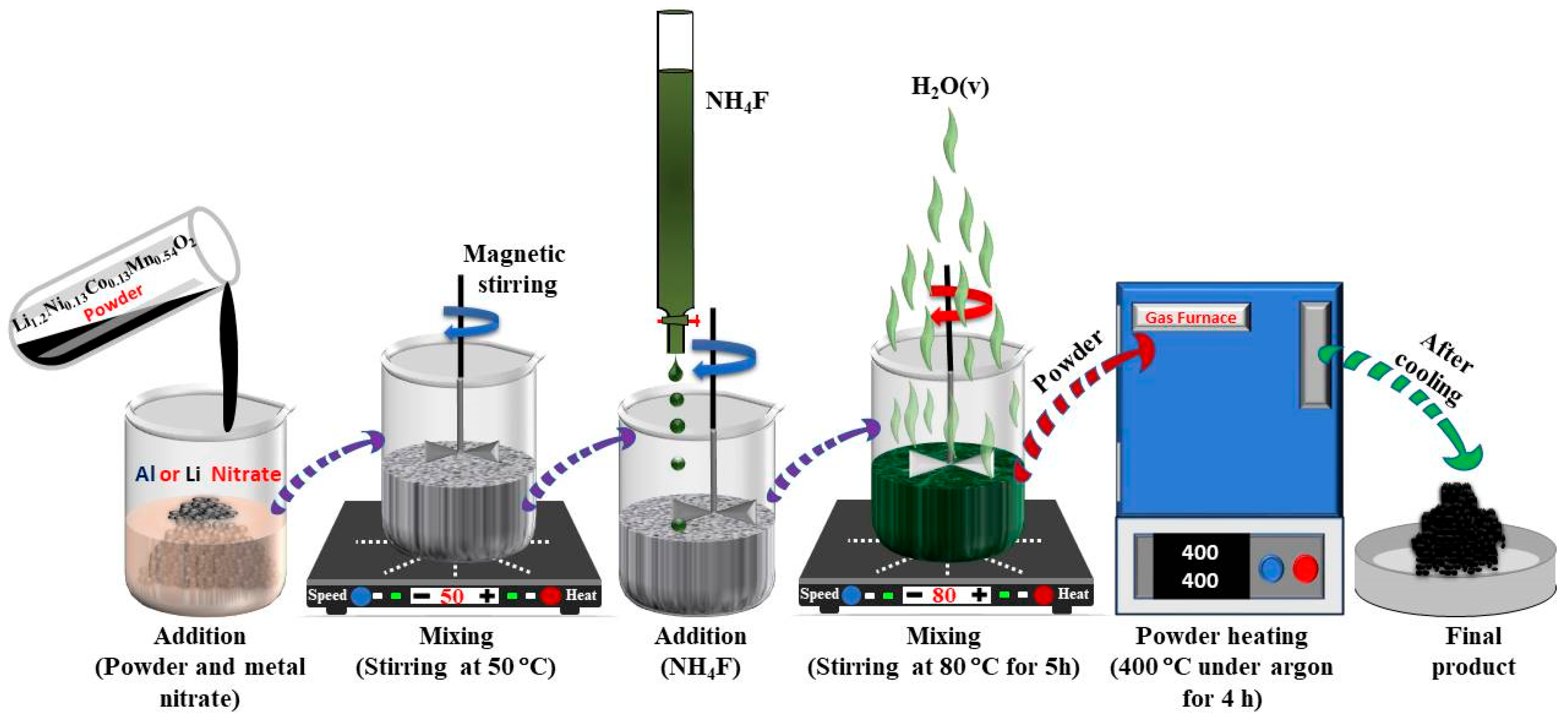 - Zou, T.; Qi, W.; Liu, X.-S.; Wu, X.-Q.; Fan, D.-H.; Guo, S.-H.; Wang, L. Improvement of the electrochemical performance of Li1.2Ni0.13Co0.13Mn0.54O2 cathode material by Al2O3 surface coating. J. Electroanal. Chem. 2020, 859, 113845. [Google Scholar] [CrossRef]