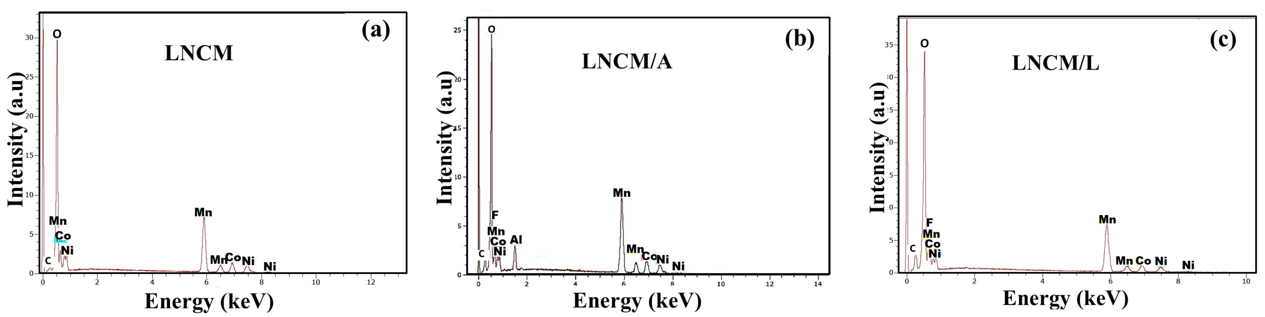 - Abdel-Ghany, A.; El-Tawil, R.S.; Hashem, A.M.; Mauger, A.; Julien, C.M. Improved electrochemical performance of LiNi0.5Mn0.5O2 by Li-enrichment and AlF3 coating. Materialia 2019, 5, 100207. [Google Scholar] [CrossRef]