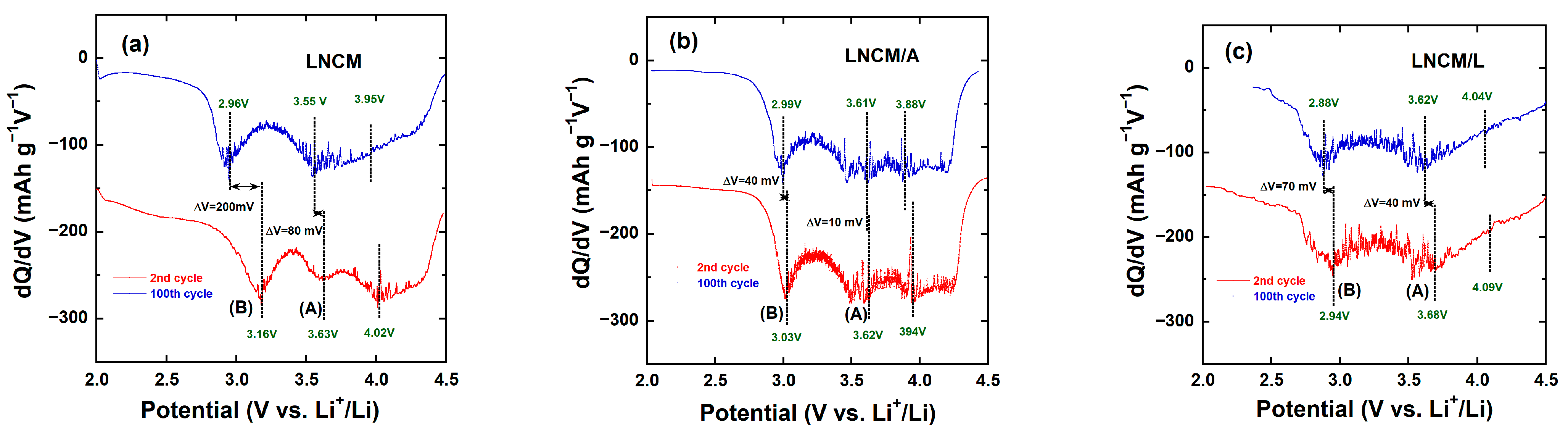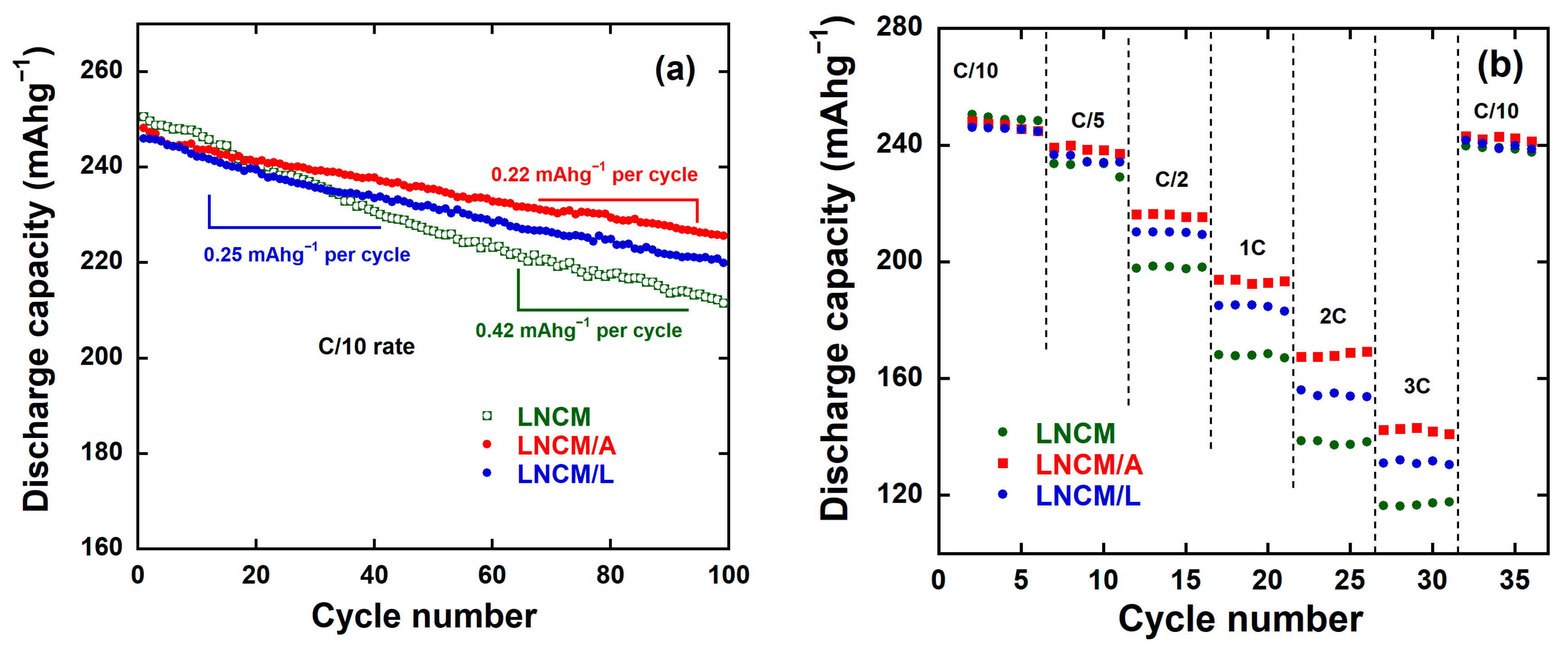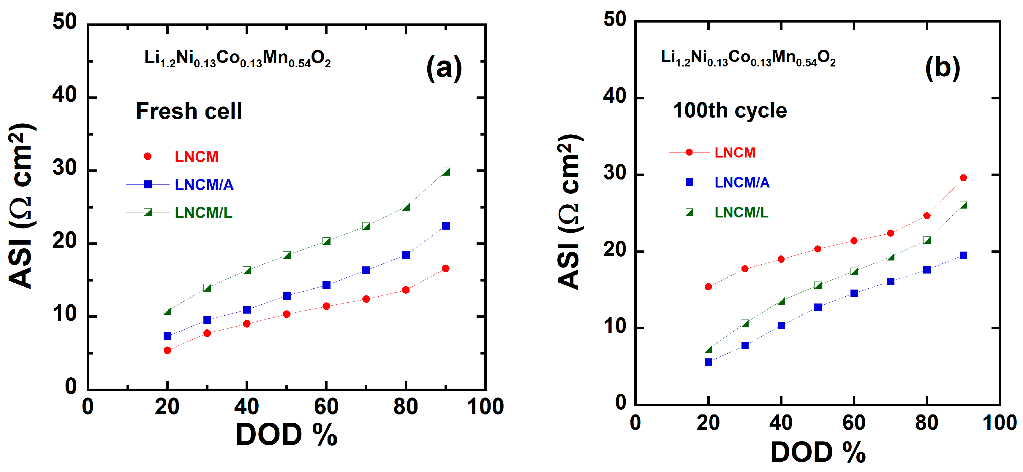 - Zhang, X.; Belharouak, I.; Li, L.; Lei, Y.; Elam, J.W.; Nie, A.; Chen, X.; Yassar, R.S.; Axelbaum, R.L. Structural and electrochemical study of Al2O3 and TiO2 coated Li1.2Ni0.13Mn0.54Co0.13O2 cathode material using ALD. Adv. Energy Mater. 2013, 3, 1299–1307. [Google Scholar] [CrossRef]