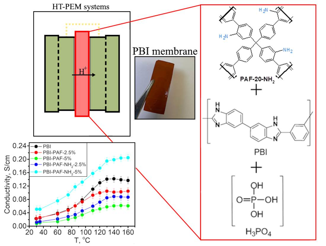 High-temperature proton exchange membrane systems (HT-PEM) based on polybenzimidazole (PBI) membranes are a promising technology offering significant advantages over their low-temperature counterparts. A key challenge limiting its long-term durability is the leaching of phosphoric acid (PA) from the membrane during operation. This work introduces, for the first time, the strategy of modifying polybenzimidazole (PBI) membranes with amino-functionalized porous aromatic frameworks (PAF-20-NH2) to fundamentally enhance their PA retention and operational stability, a critical challenge for high-temperature PEM technologies. We propose that the synergistic combination of the framework’s nanoscale porosity and the specific interaction of its amino groups create an unprecedented network for acid immobilization via reinforced hydrogen bonding. A comprehensive study of the membranes’ physicochemical and structural properties reveals that PAF-20-NH2 modification results in a significant and quantitatively demonstrated improvement in acid retention capacity, directly translating into a notable increase in proton conductivity compared to both pristine PBI and membranes modified with the non-functionalized PAF-20. These findings establish a new, highly effective pathway for the rational design of next-generation high-performance PBI-based membranes.