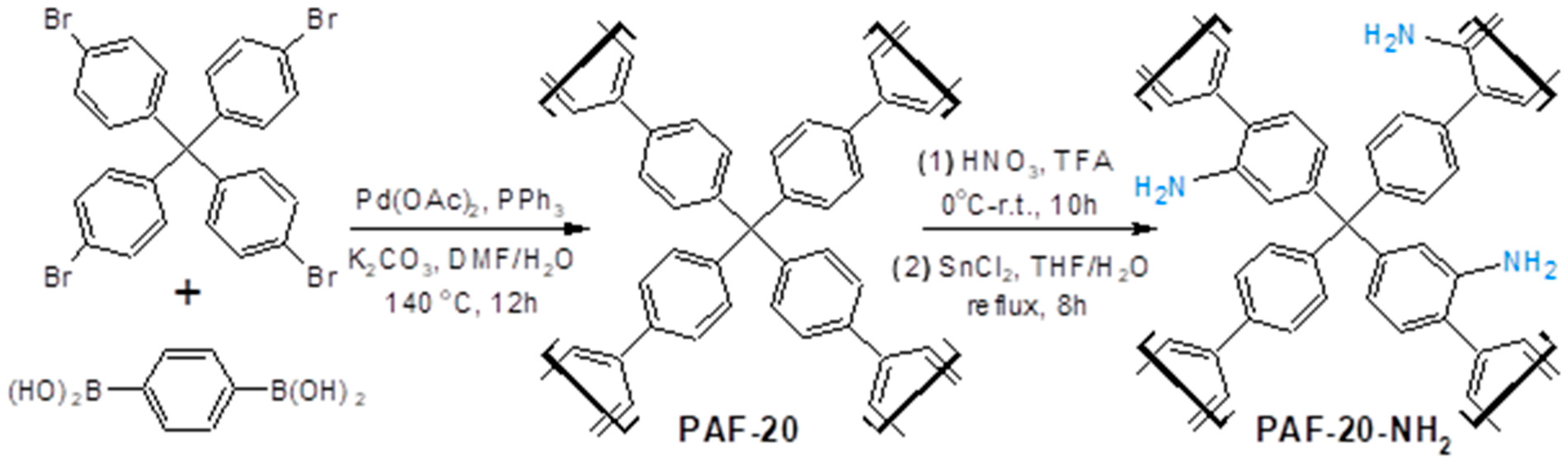 PAF-20-NH2 was synthesized by nitrating PAF-20 with nitric acid in TFA medium and reducing the nitration product with tin chloride. After the reaction, the product was washed several times with HCl and KOH solutions, and then washed with water to a neutral pH, then with THF, and finally dried under reduced pressure at 60 °C (Figure 1).