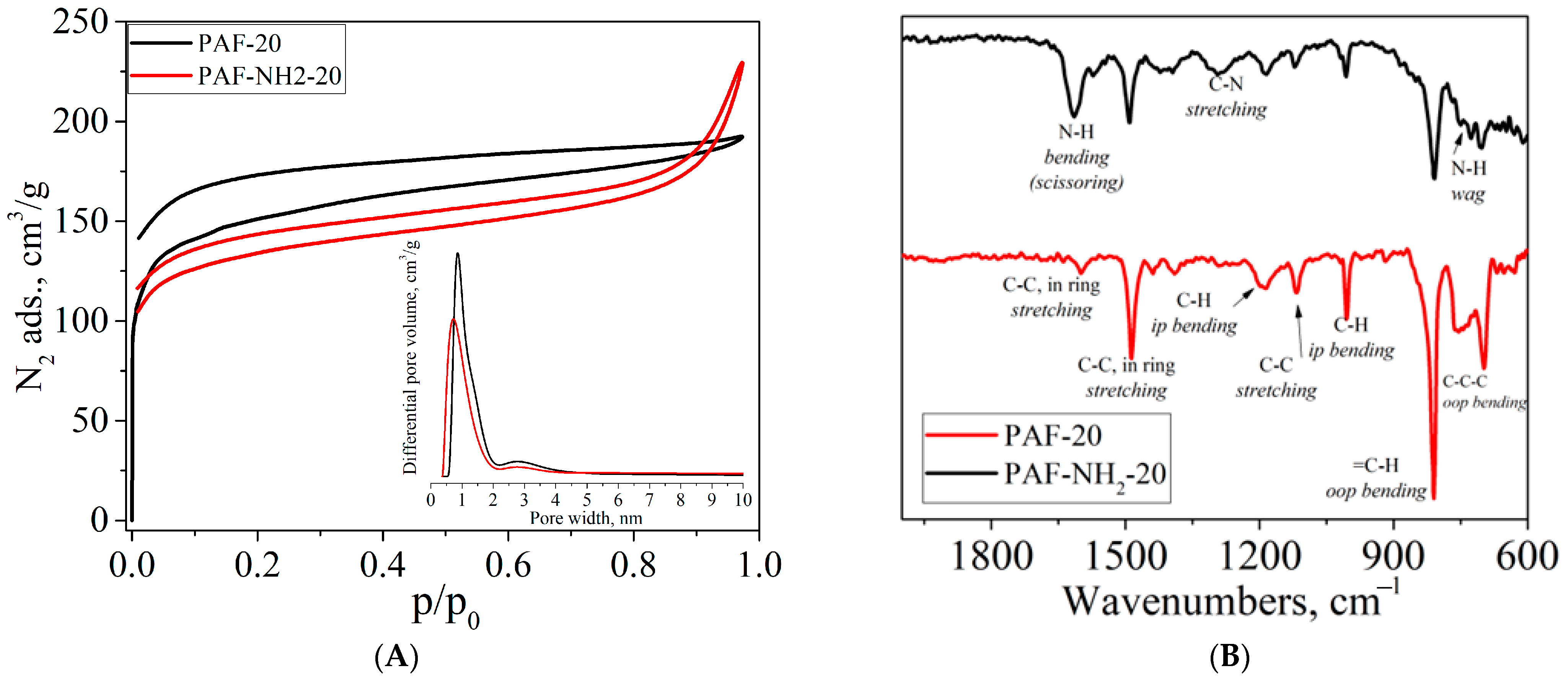 Figure 4. (A) N2 adsorption isotherms and (B) FTIR spectra for PAF-20 and PAF-20-NH2 materials.