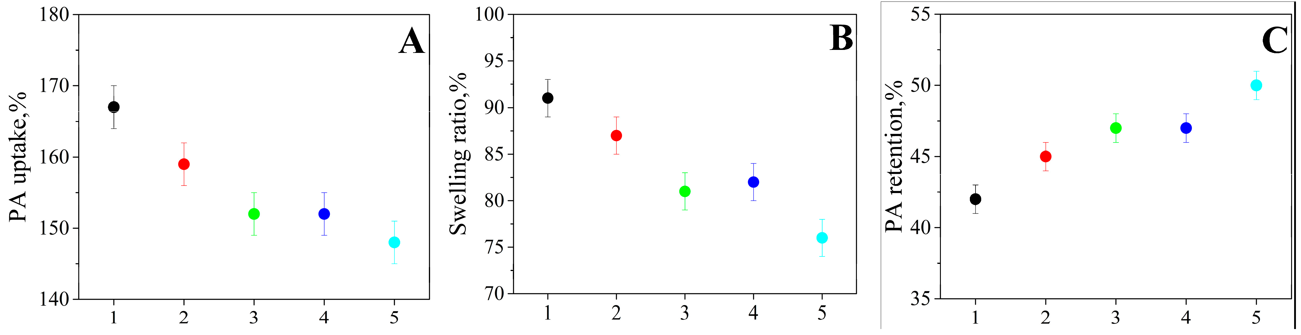 Figure 7. Plots of the measured membrane parameters. (A)—PA uptake degree, (B)—membrane swelling degree, (C)—PA retention degree.
