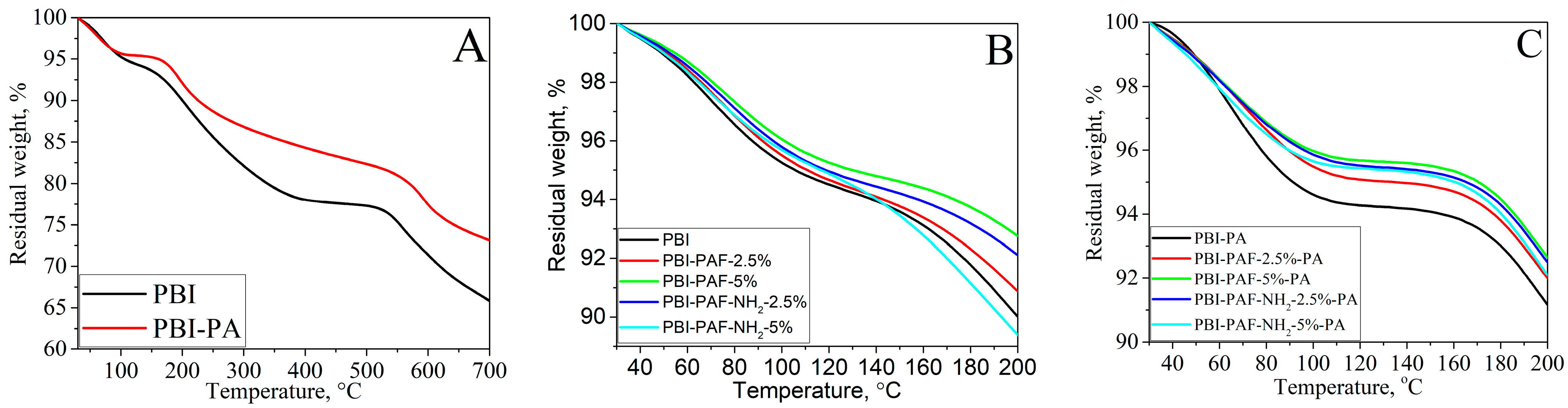 Figure 8. TGA of PBI membranes. (A)—standard membrane before and after PA doping, (B)—membrane samples before PA doping, (C)—membrane samples after PA doping.