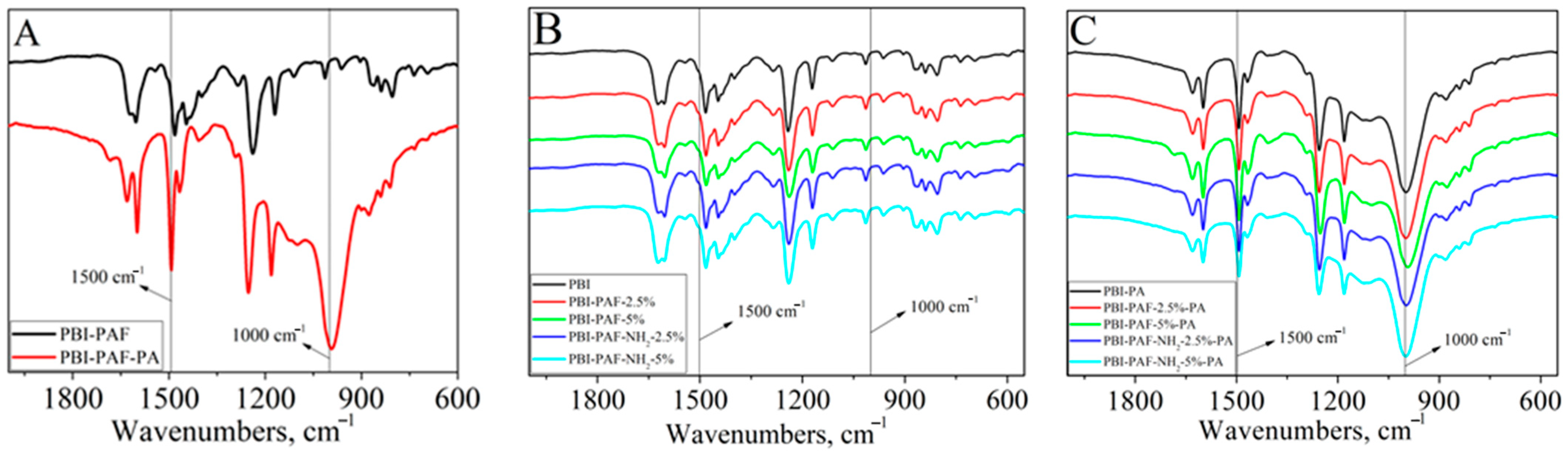 Figure 9. Fourier-transform infrared spectra for PBI-PAF and PA-doped PBI-PAF-PA (A), all samples before modification (B), and all samples after modification (C).