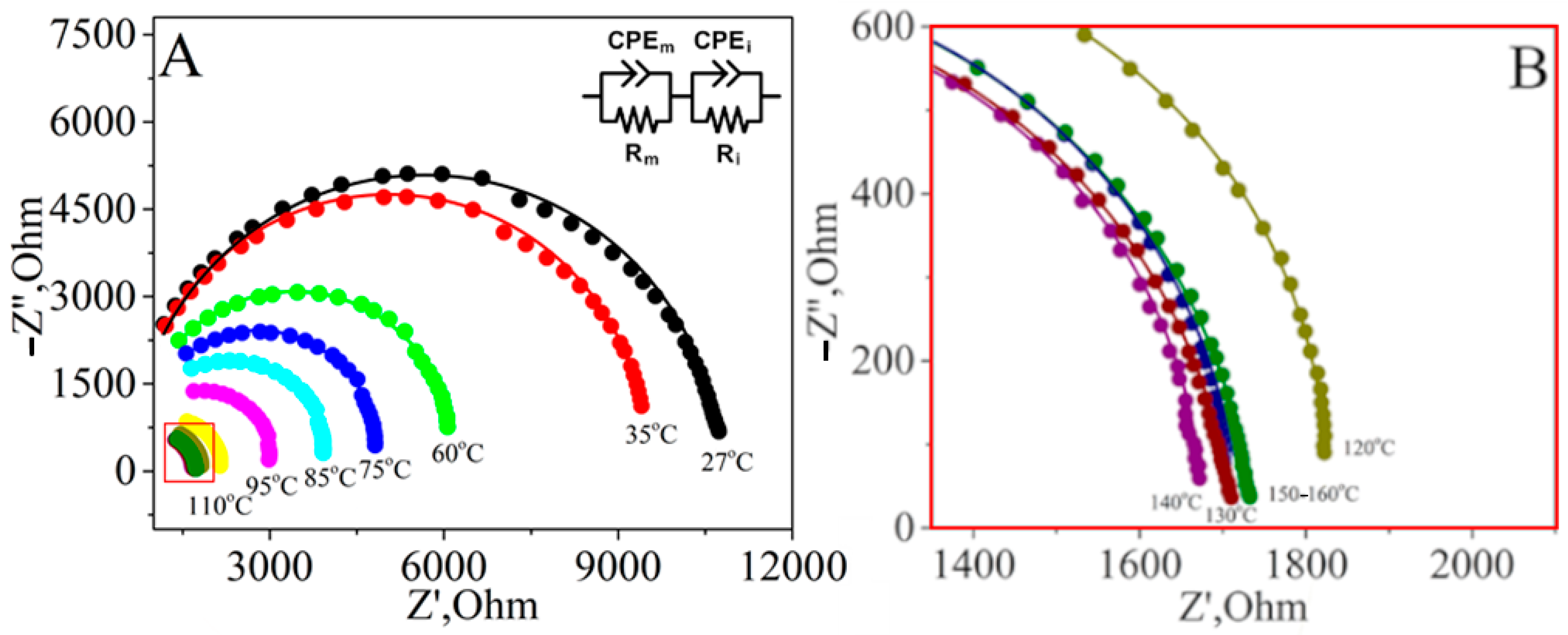 Figure 10. Nyquist plot of the standard PBI membrane for the entire temperature range (A) and in a magnified view for high temperatures (B).
