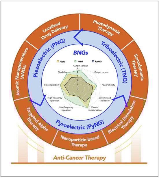 In recent years, cancers, tumors, and oncogenic diseases have increases in frequency and leading millions of people to death [,,]. The main current treatments to contrast this burden consist either of a surgical resection or chemotherapy and radiotherapy. In the first case, the removal of cancerous tumors does not provide a permanent solution to the disease; in fact, they recur in 30–50% of cases []. In the case of chemo/radio-therapies, the treatments can inhibit the recurrence of cancerogenic conditions, facilitating the cancer regression [,], but they have various levels of effectiveness and their impact affects also non-cancerous dividing cells, implying a non-specifically spread toxicity. Novel treatments are thus urgently needed with higher efficiency and accuracy, fewer side effects and permanent effectiveness. Recently, new therapies have been proposed, including drug delivery through nanocarriers, gas therapy [], electrical stimulation [], nanozyme-based catalytic therapy [], photodynamic therapy [,,], sonodynamic therapy [], etc. The common element of these treatments consists of delivering anti-cancer agents in a localised and specific manner. To this purpose, microdevices or nanodevices that can be manipulated and controlled accurately are increasingly needed: these can take the form of nanocarriers (nanoparticles, nanoparticles-embedded liposomes, etc.) or smart bioelectronic patches that can deliver anti-cancer drugs or electrical signals for actuating biochemical effects against the propagation of cancers. All these strategies and unconventional therapeutic platforms need to be connected to a power source or ideally self-powered. Nanogenerators have emerged as a useful and effective technology for supplying electrical power to other systems: distributed networks of these devices harvesting energy provide a promising alternative that can complement standard power plants [,,,]. Invented in 2006 by Wang’s group [], they can convert energy from the available sources (i.e., mechanical, thermal, biochemical, etc.) into electrical energy [,], due to intrinsic properties of their constituent materials and at the microscale/nanoscale, against conventional bulky systems for energy generation [,,,], especially chemical batteries which need periodic recharging, are unsuitable for being installed in hostile places and have a limited lifetime [,,,,]. They are mostly employed to scavenge energy from the environments and natural resources of clean energy [,,,,,,,,,,], e.g., environmental vibrations, wind flows, water waves, ocean currents, impacts of rainfalls, human biomechanics (voluntary movements, heartbeat, breathing, blood circulation, etc.) but also for sensing human motion [,,], monitoring physiological parameters [,,,,,], for supplying implantable biomedical devices [,,] or wearable systems for robotics [,,]. The recent advancements in electronics, i.e., miniaturization, multifunctionality, property-tunability, softness, flexibility, conformality, and design adaptability, have fueled the rapid and continuous development of different types of nanogenerators, with novel materials [,,] and applications [,,,,,,,,,,,]. The most common nanogenerators developed over the years are based on the piezoelectric, pyroelectric, and triboelectric effects [,,], which intrinsically lead to charge generation upon the application of a mechanical strain, deformation, stress, temperature change, or friction between two dissimilar materials [,,]. These devices have gained attractive properties, e.g., light weight, flexibility, simplicity of designs, durability, and cost-effectiveness. Additionally, their biocompatibility has made them suitable for being implanted and powering devices for stimulation or drug delivery for many diseases, including cancers [].