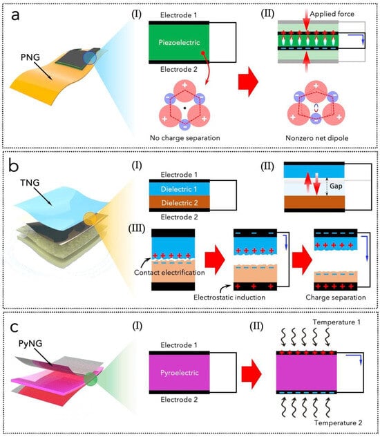 Illustrations of the fundamental working principles of piezoelectric (a), triboelectric (b), and pyroelectric nanogenerators (c). (a,b) Reprinted from [], MDPI, Creative Commons Attribution (CC BY) license.