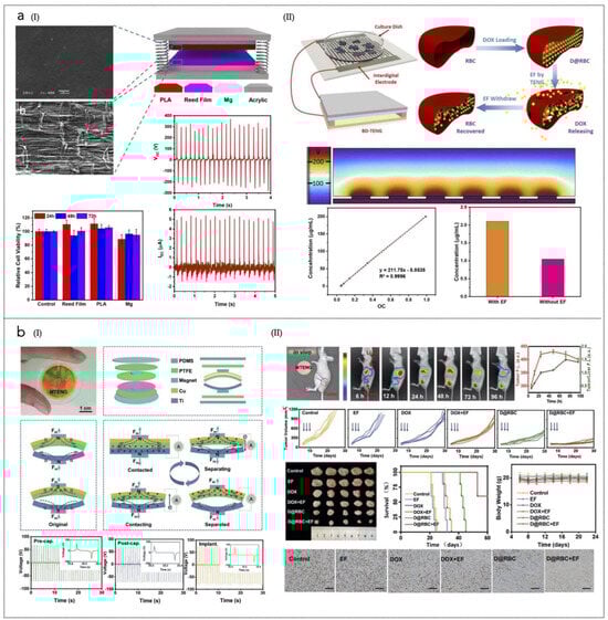 (a) (I) Illustration of the prototype TNG with SEM images of the biodegradable film and PLA and reed film. The plots show the electrical signals with an outside force, Voc, Isc, and cell viability after 3 days of culture in media supplemented with several biodegradable films. (II) BI-TENG-controlled constructs used to control DOX release: DOX standard concentration curve and D&RBC before and after electric field stimulation are shown in the plots. Reprinted from [], Springer Nature, Creative Commons Attribution 4.0 International License. (b) (I) Schematic diagram, device structure and output performance of the MTENG. Working principle of the MTENG; Voc of the MTENG before and after encapsulation; Voc of the MTENG after encapsulation and implanted subcutaneously in streaky pork. (II) MTENG-controlled RBC DDS in vivo. The images show blood circulation and accumulation to tumors of the D@RBCs obtained by in vivo imaging system at 6, 12, 24, 48, 72, and 96 h, respectively. The in vivo tumor growth curve is shown; blue arrows indicate the treatment time point: Day 6, Day 8, and Day 10. The other images of the harvested tumors in various groups after 1 month. At the bottom, the Ki67 immunohistochemistry images of the tumors in various groups are shown (scale bar: 200 µm), together with the survival curves of the mice in various groups, and the body weight of the mice. Reprinted with permission from []. Copyright 2019, Wiley-VCH GmbH.