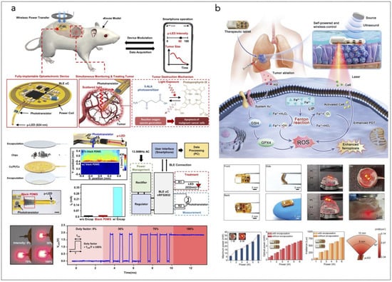 (a) Overall concept of cancer treatment and monitoring system including device schematic, principle of device operation that enables fully programmable μ-LED intensity control and real-time monitoring of tumor size, and chemical mechanism of PDT. The device includes PDMS/SiO2/parylene C encapsulation layers and a probe part containing black PDMS for blocking internally reflected light; Scale bar, 1 mm. The block diagram of electronic components for wireless operation includes wireless power transfer, light delivery control, photocurrent measurement, and wireless communication with a smartphone. Pulse width modulation of the μ-LEDs with intensity of 0%, 30%, 70%, and 100% is shown, together with forward voltage of the μ-LED when duty factor is sequentially changed to 30%, 70%, and 100% from 0%. Reprinted from [], Springer Nature, Creative Commons Attribution 4.0 International License. (b) Ferroptosis inducer IKE, when combined with photodynamic therapy, presents a novel approach to cancer treatment. IKE induces ferroptosis in tumor cells by locally inhibiting the SLC7A11-GSH-GPX4 signaling pathway. Concurrently, iron ions accumulate in the body and enhance the cellular hypoxic environment through the Fenton reaction. The therapeutic tablet is minimally invasively implanted into the primary lung cancer site, and ultrasound drives the µLEDs to activate the photosensitizer chlorin e6 (Ce6), utilizing oxygen supplied by IKE to enhance photodynamic therapy, generate reactive oxygen species (ROS), and deplete glutathione (GSH). The accumulation of ROS leads to ferroptosis in lung cancer cells due to the formation of lipid peroxides. Reprinted from [], Wiley-VCH GmbH. Creative Commons Attribution 4.0 International License.