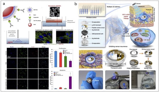 (a) Illustration of barium titanate NP functionalization with antibody against transferrin receptor (TfR). The scheme shows the NP crossing through a static 3D model of the blood brain barrier and chronic piezoelectric stimulation of glioblastoma cells. At the bottom, CLSM imaging of Ki-67 and p53 expression in different experimental conditions for NP-assisted piezoelectric stimulation to improve anticancer efficacy of TMZ. Reprinted with permission from []. Copyright 2018, Elsevier. (b) Design and structure of implantable self-powered therapeutic pellet, with an integrated µLED with flexible serpentine electrode, with wireless PDT/SDT hybrid therapy for inhibiting cancer recurrence. Reprinted with permission from [], Copyright 2022, Elsevier.