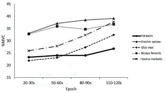Using the relative change in surface EMG activity to make coaching decisions also means that individual muscle MVCs are unnecessary. In fact, interpreting the data normalized to MVC could be contra-indicated in this situation. The isometric squat is a multi-joint action and it should be anticipated that the individual muscle groups’ absolute action be different as they are performing different functions and are at varied muscle lengths. It also cannot be assumed that each muscle’s EMG amplitude will increase linearly with the isometric squat force. Lastly, the MVC procedure in this methodology does not target each muscle using a single joint movement, meaning that the peak muscle activation measured could be underestimated [,]. With the preceding three points, a direct comparison of the absolute activation between different muscles can lead to inappropriate conclusions. Our approach to identifying compensations during fatigue necessitates that the relative change to baseline be assessed. However, activation relative to MVC can still have some utility when investigating muscle activation strategies in the isometric squat.