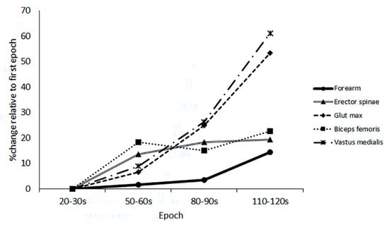 Group change in surface EMG amplitude relative to the first epoch (20–30 s). Standard deviations are not presented to enhance figure clarity but are available in Table 2.