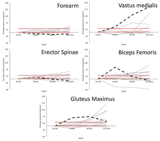 Individual surface EMG amplitude data change relative to the first epoch for each muscle. Y-axis scale is maintained for each graph. Horizontal red bars represent 95% CI for change expected due to fatigue determined from the forearm muscle during the isometric handgrip test. Bold, dashed line indicates the subject with the highest recorded change in vastus medialis EMG amplitude.