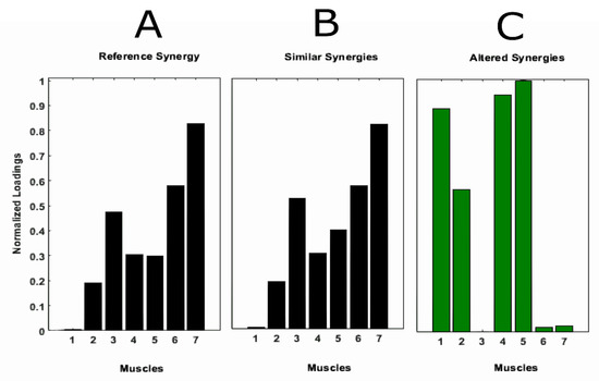 (A) Reference Synergy, (B) Similar Synergy, (C) Altered Synergy. The similarity in these synergies is generally quantified using cosine correlation or Pearson correlation. It is clear from this figure that (C) reveals differences in the muscle composition loading compared to (A,B).