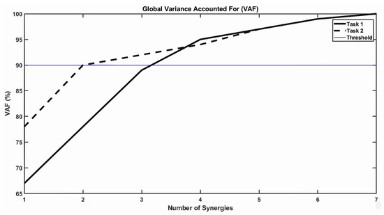Task 1 and Task 2 show differences in the number of synergies based on the VAF threshold of 0.9 or 90%. The minimum number of synergies that account for 90% reconstruction for task 2 is two, and for task 1 is nearly 3. These indicators are used later to extract synergies two and three, respectively. The extracted synergies are later compared for similarity or other analysis depending on the research hypothesis.